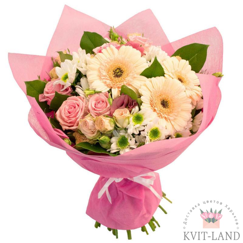 Гербера 3 шт. Троянда (Київ) 7 шт. Троянда кустова 3 шт. Хризантема 1 шт. Зелень. Упаковка.