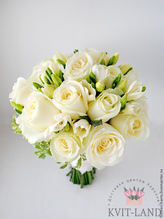 Троянда біла (Київ) 9 шт. Фрезія 9 шт. Левкодендрон 3 шт. Декор.