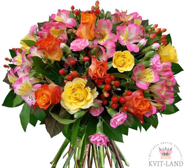 Троянда (Кенія) мікс 11 шт. Альстромерія 5 шт. Хіперікум 5 шт. Гвоздика.