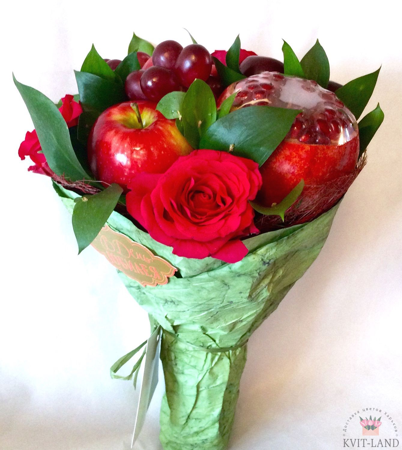 Гранат 1 шт. Яблуко 1 шт. Виноград гроно. Троянда 1 шт. Троянда кущова. Упаковка.